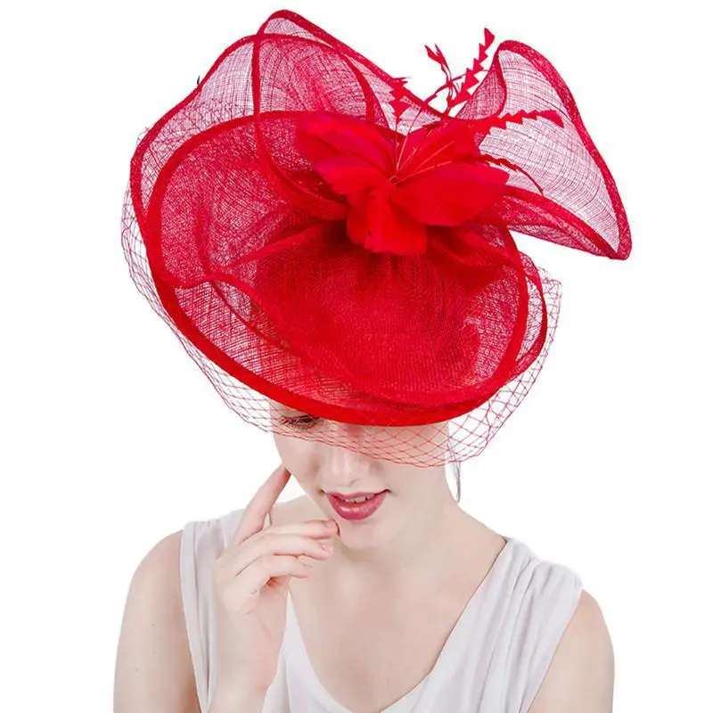 معرض ل الأوروبية الأمريكية الكتان شبكة الحجاب ريشة الزفاف الزفاف عقال أزياء السيدات مأدبة الحصان سباق مهرجان غطاء الرأس